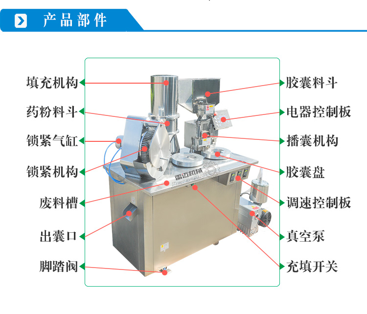 3.充填剂量准确,操作方便,机身及工作台面采用不锈钢制造,产品符合规定的GMP要求。适用于粉状、颗粒状的药品及保健品的胶囊充填。